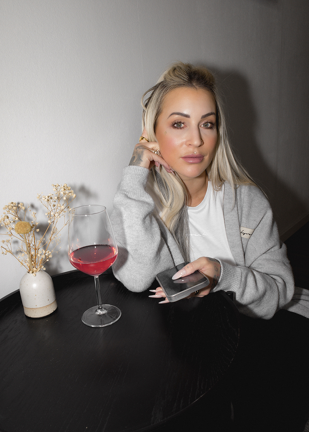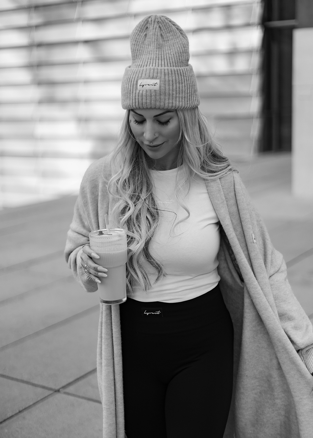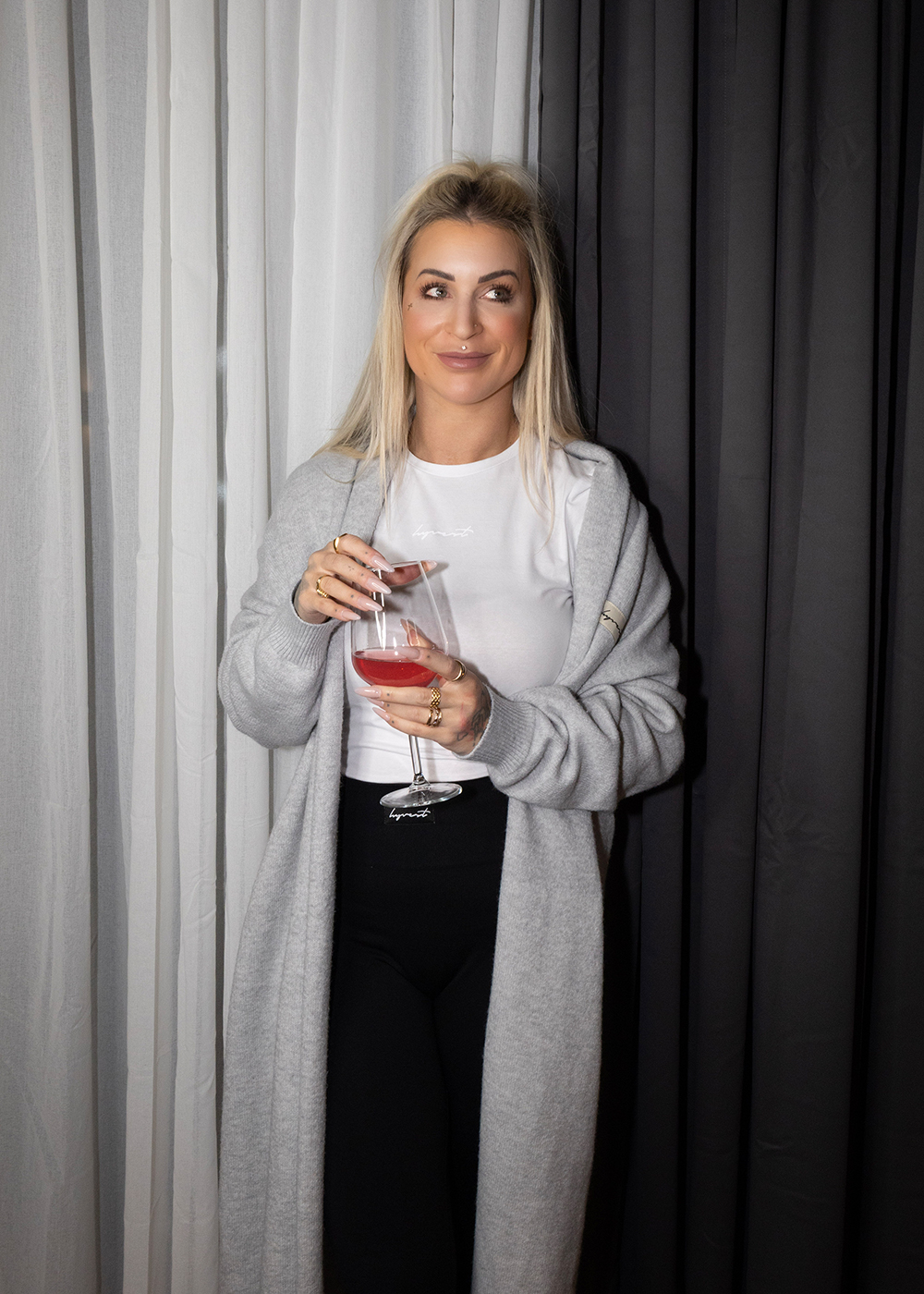 Pepper entspricht Größe S und trägt UNISIZE für einen lockeren Schnitt bei einer Körpergröße von 1,63m und einem Gewicht von 59kg.