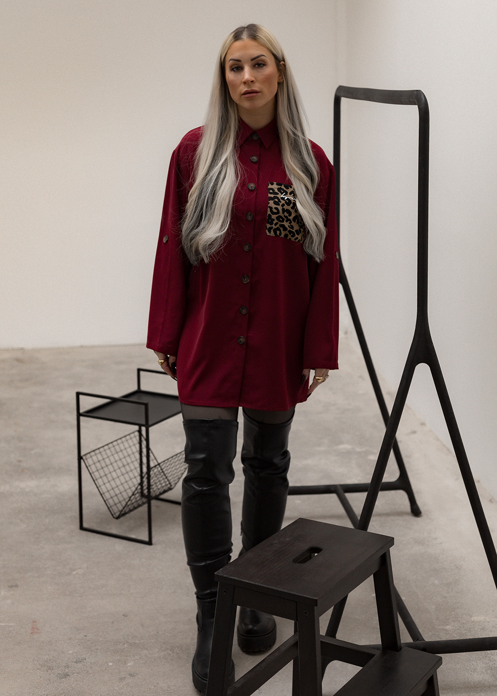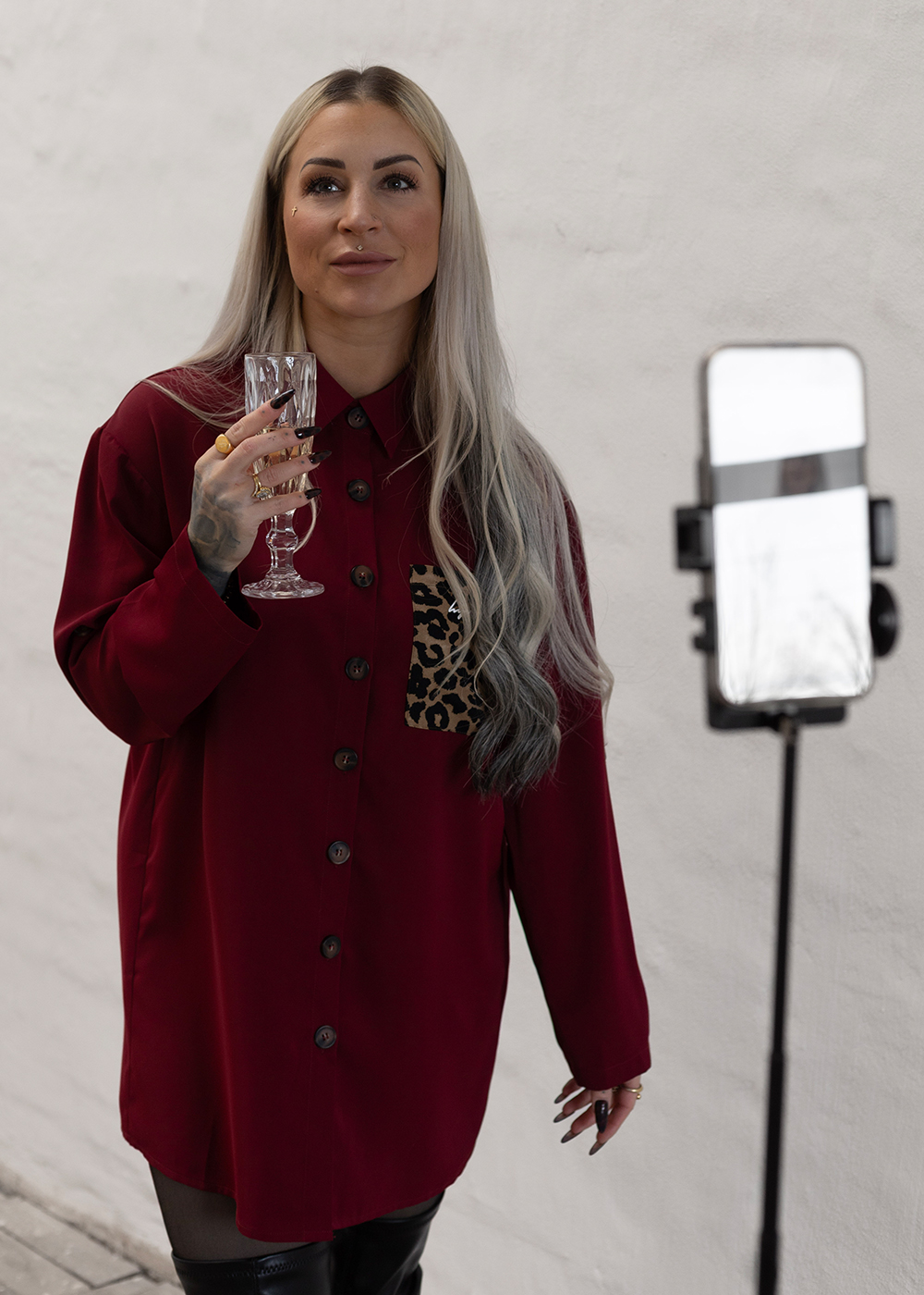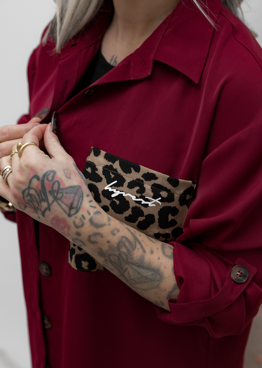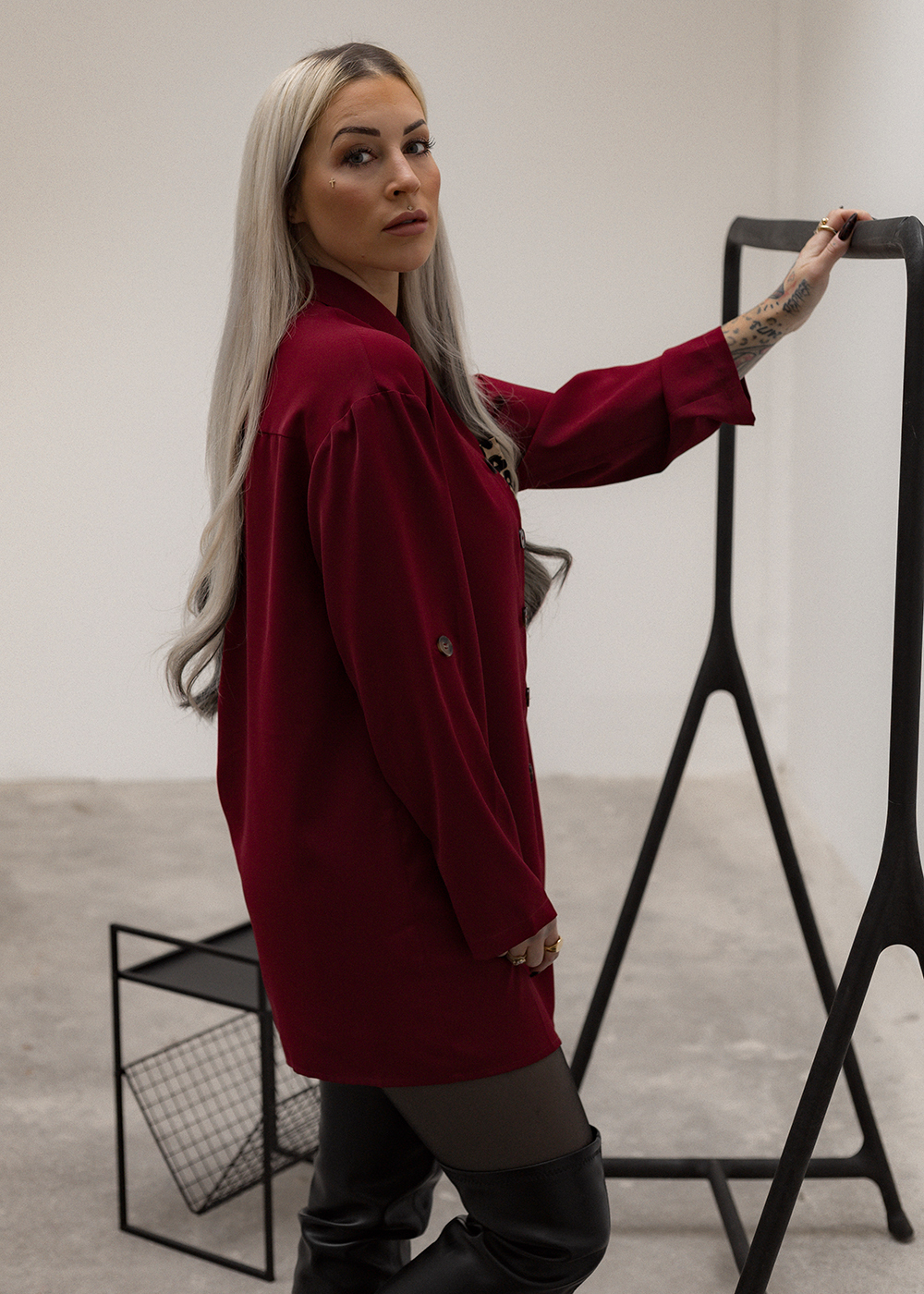 Der Burgunder-Ton, der jedem Outfit sofort Wärme gibt – kombiniert mit dem Signature Leo Patch im typischen HYVEST Look. Der Blouson fällt locker, ist easy zu layern und hat diesen cleanen, weichen Stoff, der nicht knittert und sich super smooth trägt. Lässig offen, cozy geschlossen, easy hochgekrempelt: ein Allrounder für Alltag, Büro & Dinner.