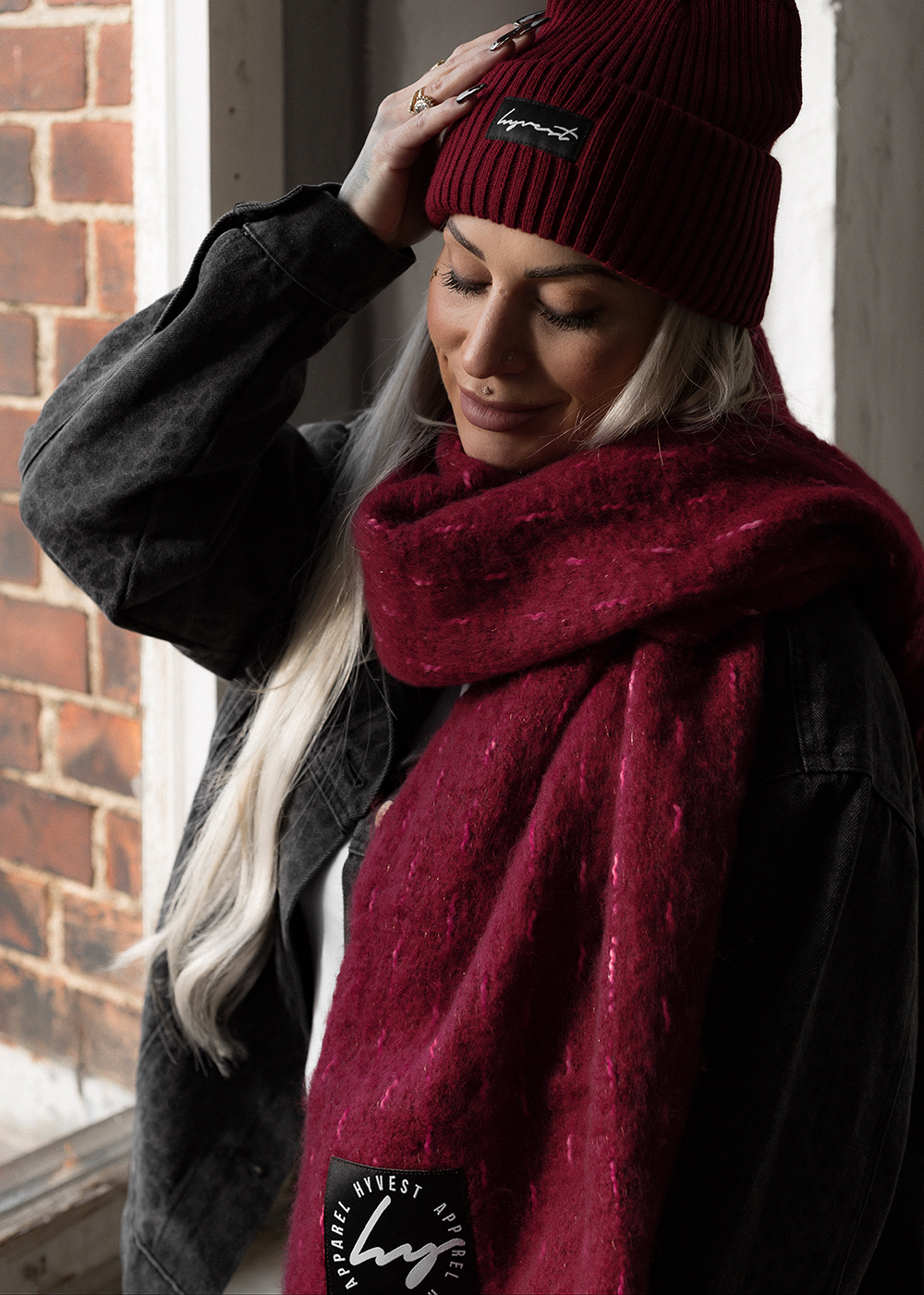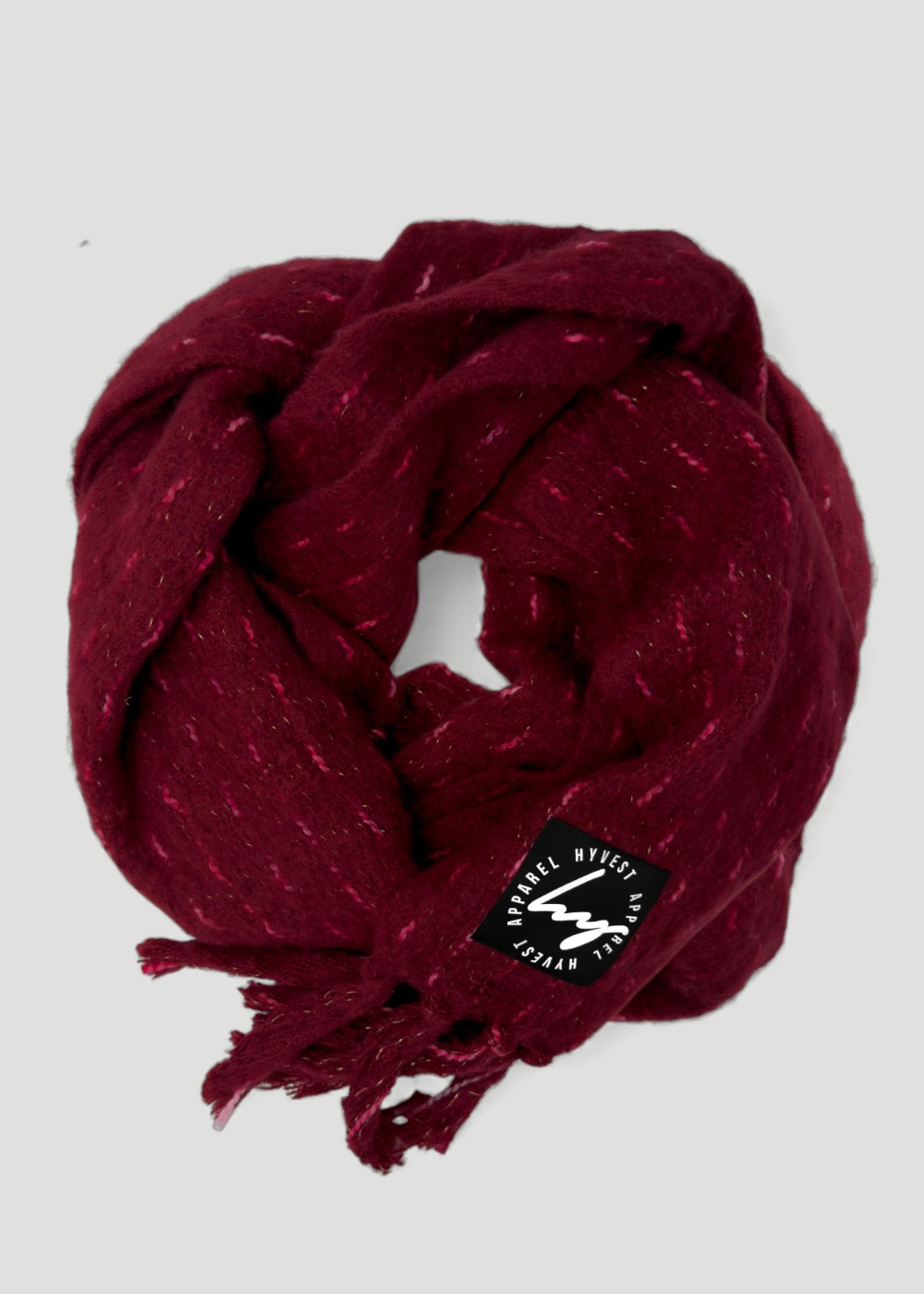 Soft, warm, kuschelig – und dieser Wine-Ton ist einfach special. Der Schal ist groß genug, um dich einzuwickeln, aber leicht genug, um ihn den ganzen Tag zu tragen. Mit HYVEST Logo Patch als cooles Detail. HYVEST Keypiece: mehr Schal als Kopf. Maße: L 200cm x B 40cm