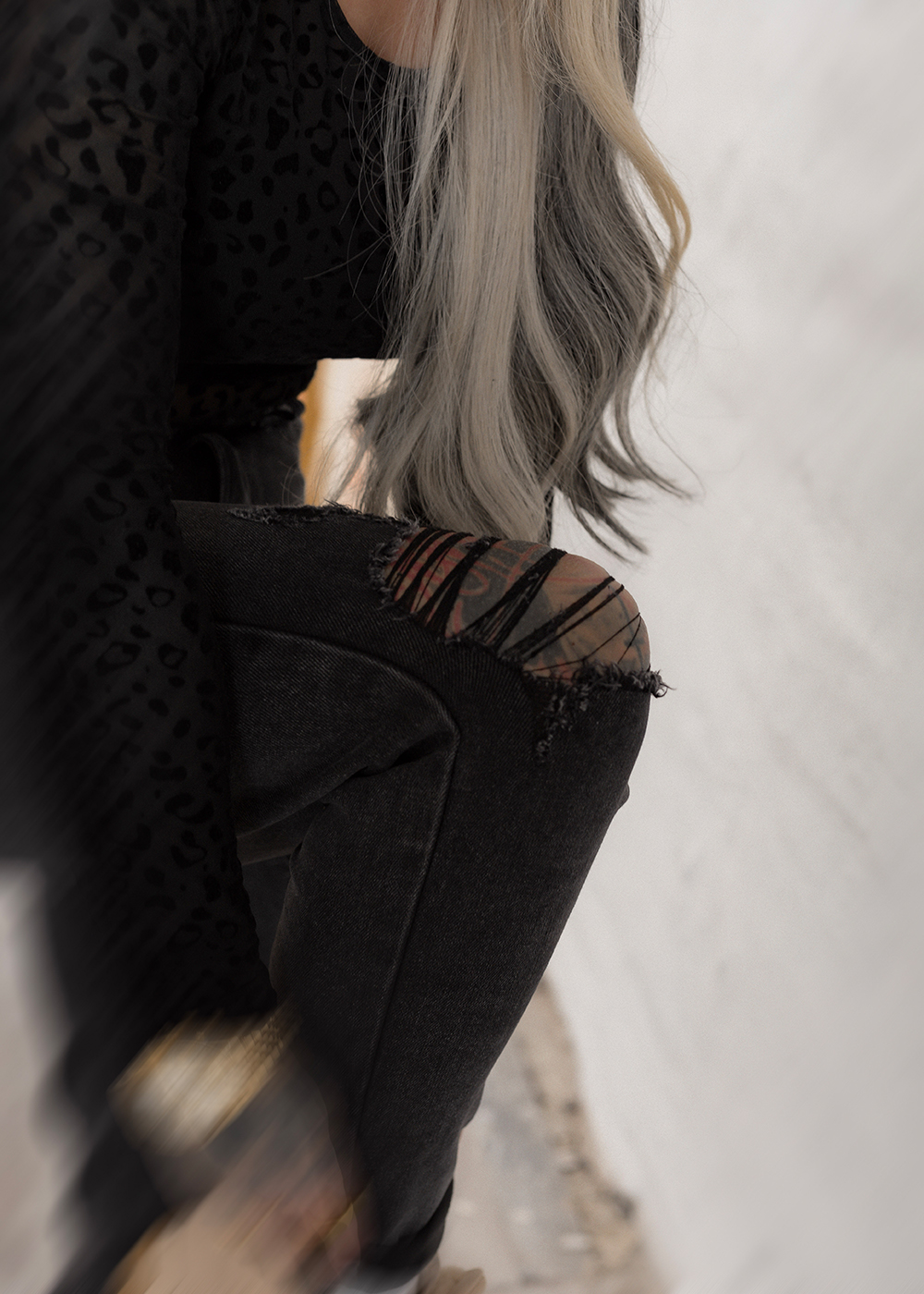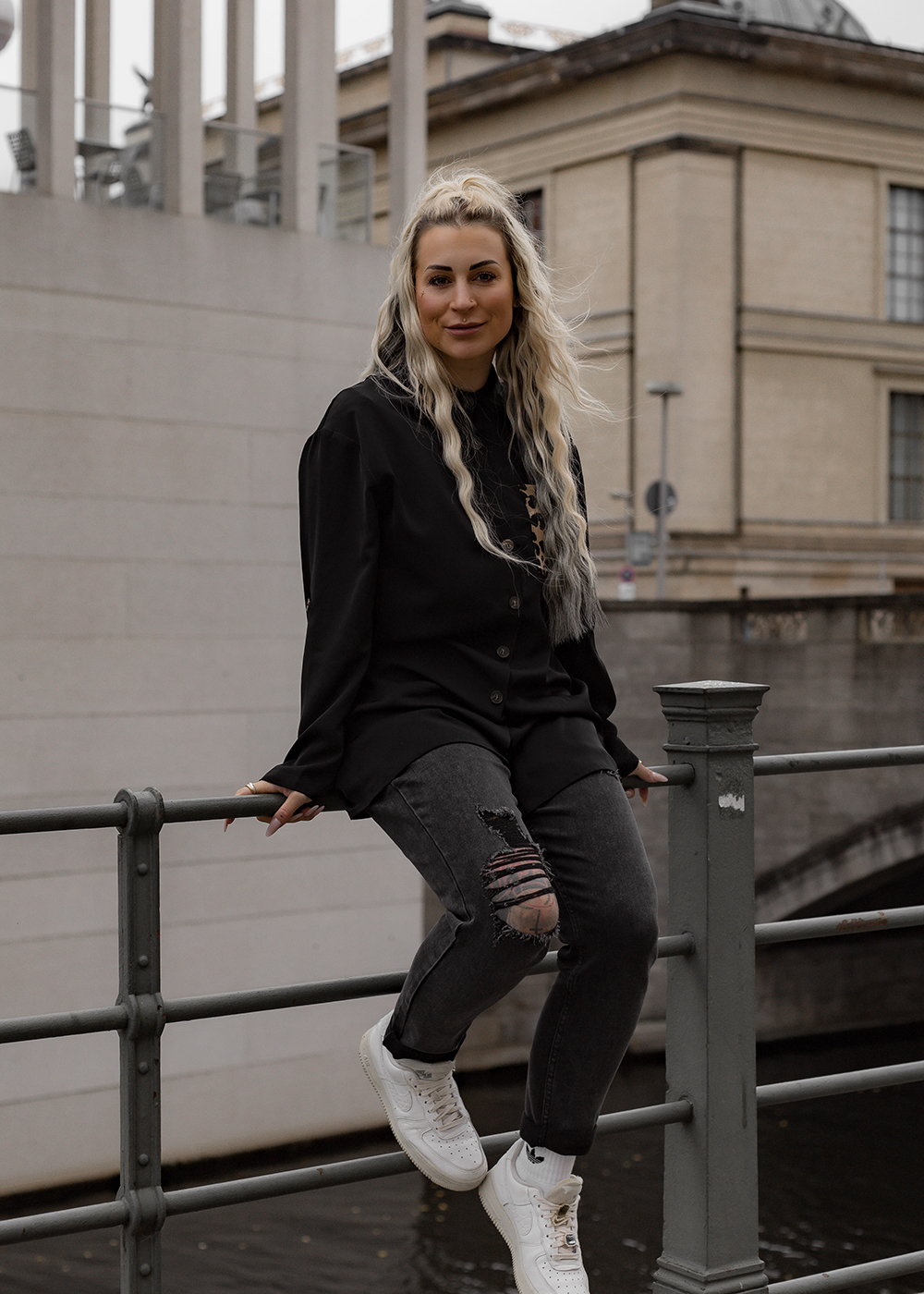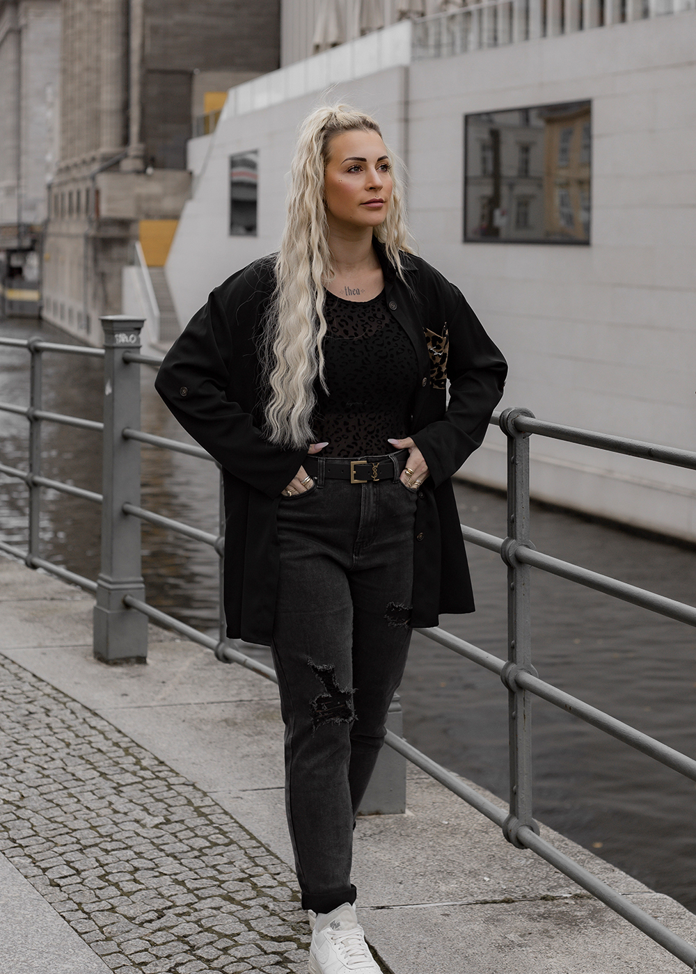 Pepper entspricht in Hosen Größe M und trägt hier eine Nummer kleiner - Größe S - bei einer Körpergröße von 1,63m und einem Gewicht von 59kg.