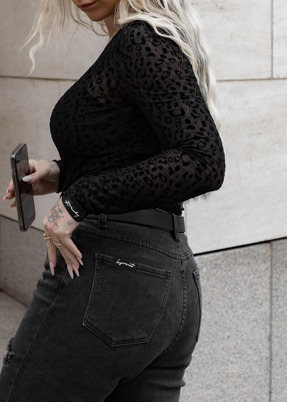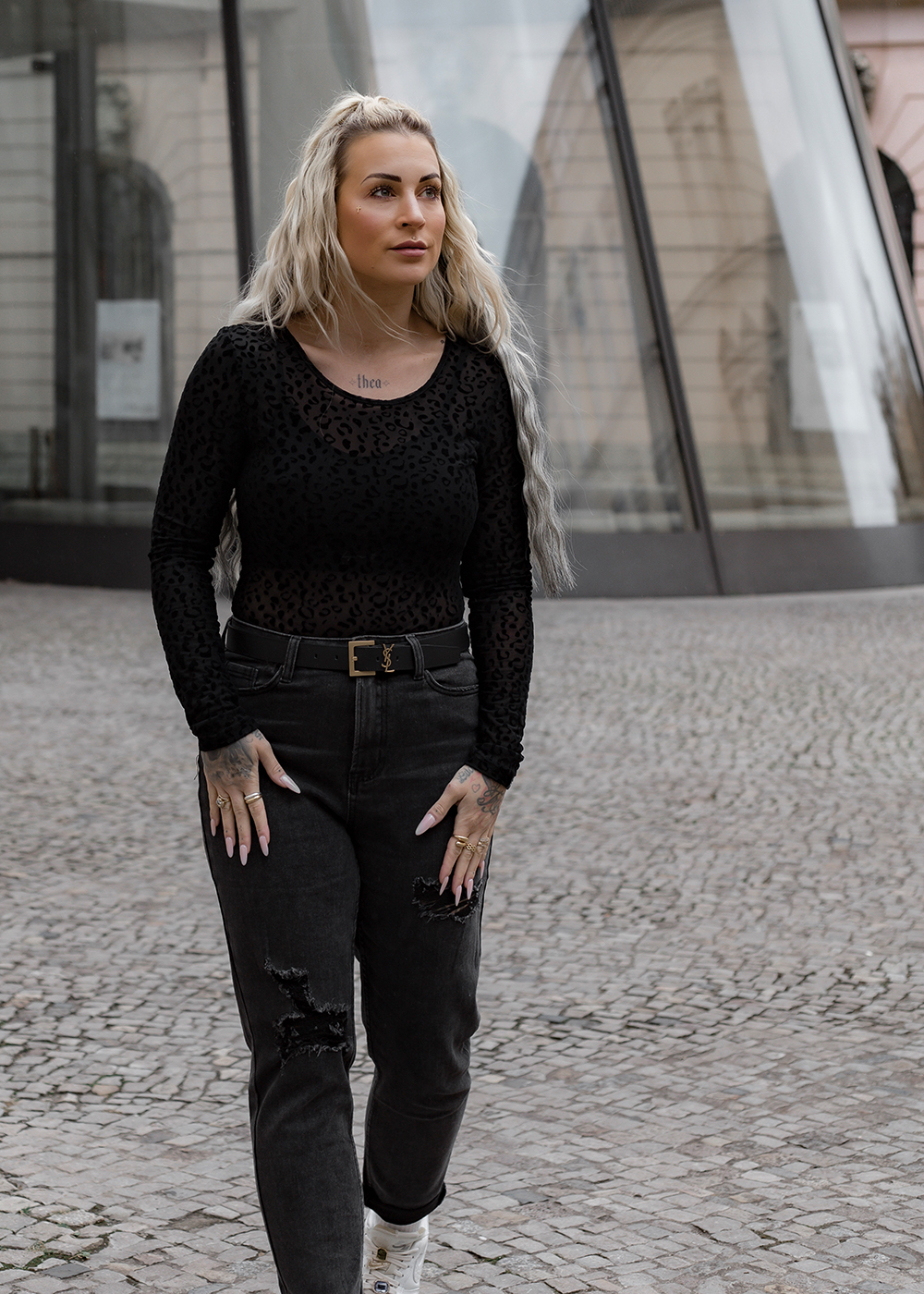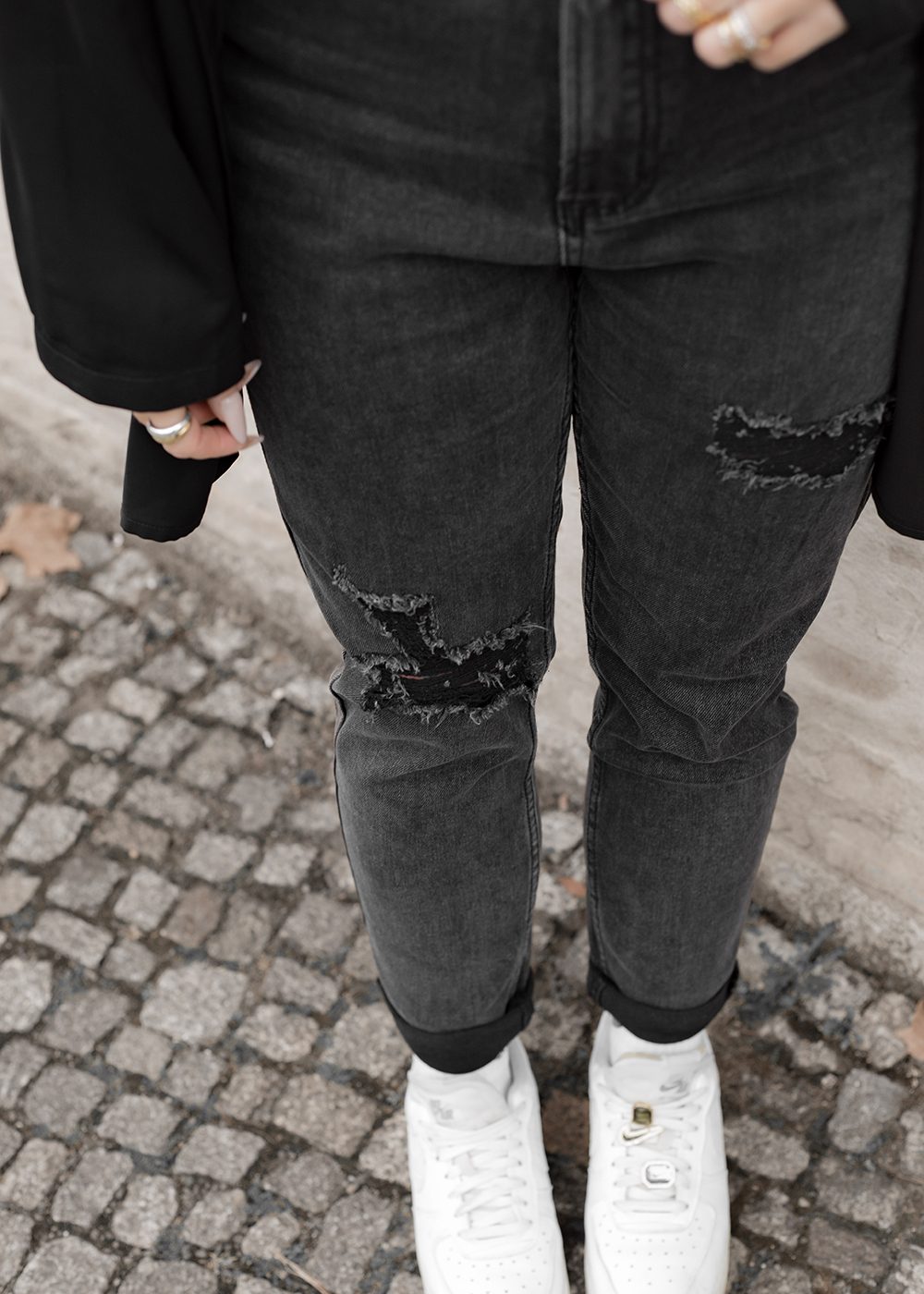 Der Fit: lässig oben, schmaler unten – die perfekte Mom Jeans. Der Anthracite Ton wirkt hochwertig, die leichte Destroyed-Optik macht sie modern. Der Stoff ist flexibel, nicht steif, und formt ohne einzuengen. Perfect Match zur Jeansjacket - ein Outfit, das immer funktioniert.