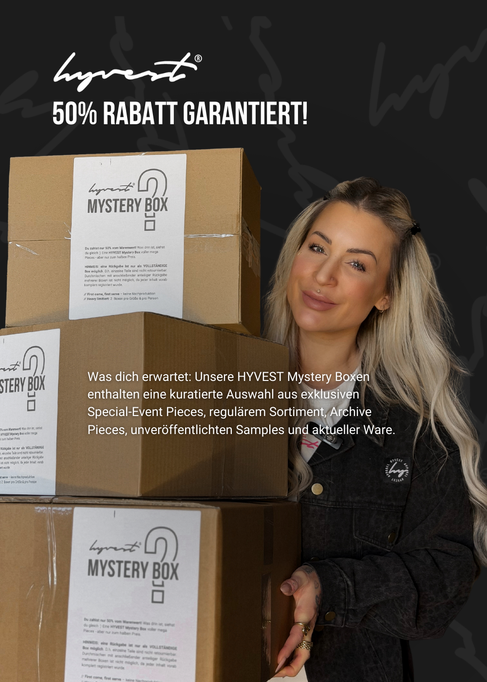 Du zahlst 50 % vom Warenwert ? – was drin ist, bleibt geheim. Eine HYVEST Mystery Box voller mega Pieces - aber nur zum halben Preis. Unsere HYVEST Mystery Boxen enthalten eine kuratierte Auswahl aus exklusiven Special-Event Pieces, regulärem Sortiment, Archive Pieces, unveröffentlichten Samples und aktueller Ware. Der Inhalt bleibt bis zum Öffnen geheim – aber eines ist sicher: Du zahlst garantiert nur 50 % des gesamten Warenwerts. Kein Sale-Ramsch. Keine Restposten. Nur echte HYVEST Pieces, die wir auch regulär verkaufen oder verkauft haben. Jeder Preis entspricht exakt 50 % des ursprünglichen Warenwerts!