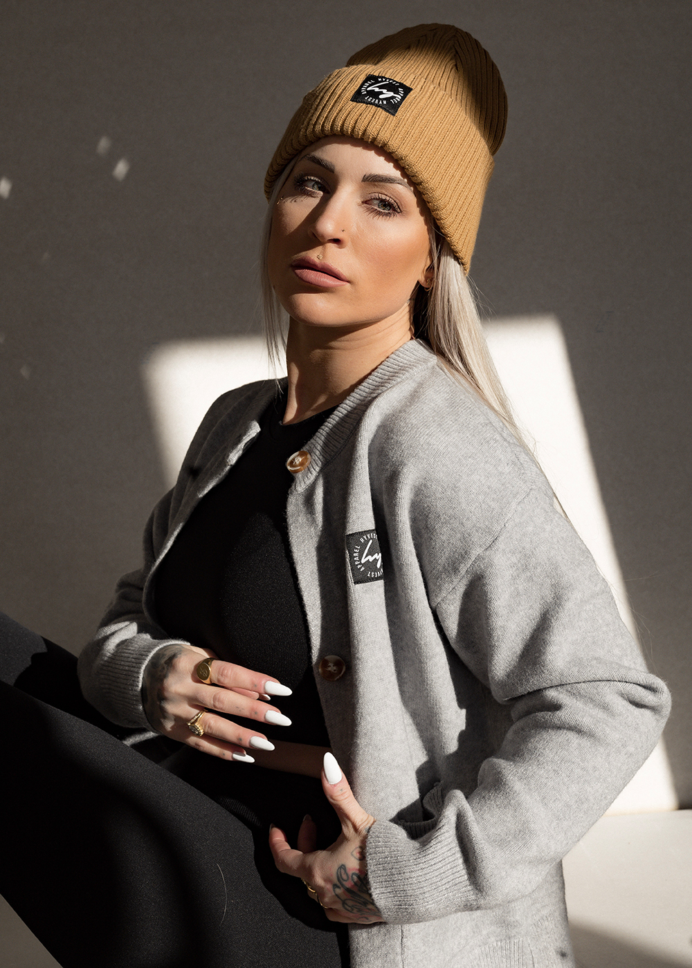Pepper entspricht Größe S und trägt UNISIZE für einen normalen Schnitt bei einer Körpergröße von 1,63m und einem Gewicht von 59kg.