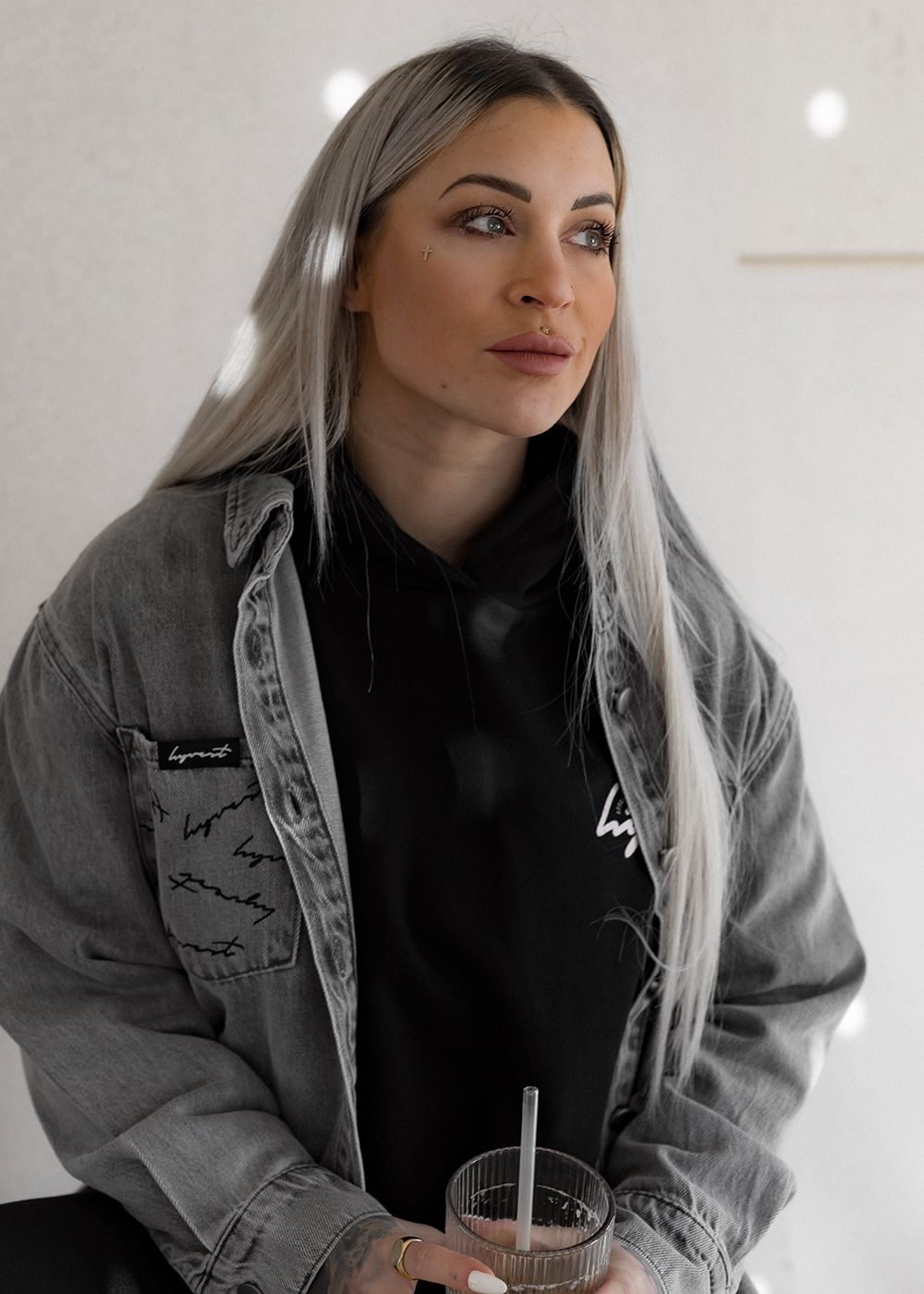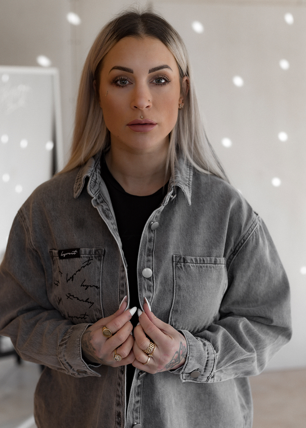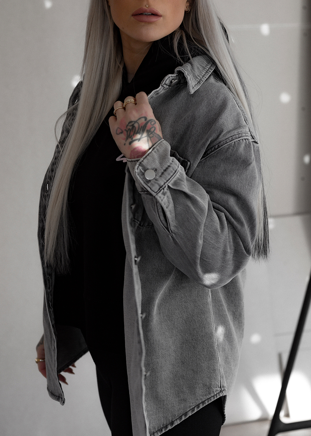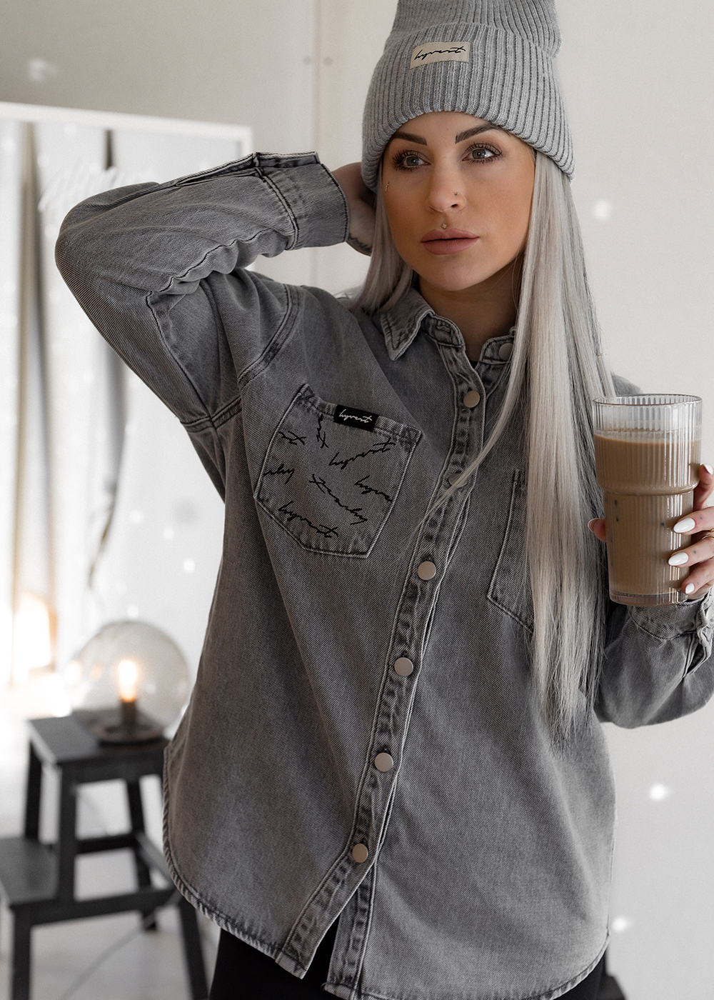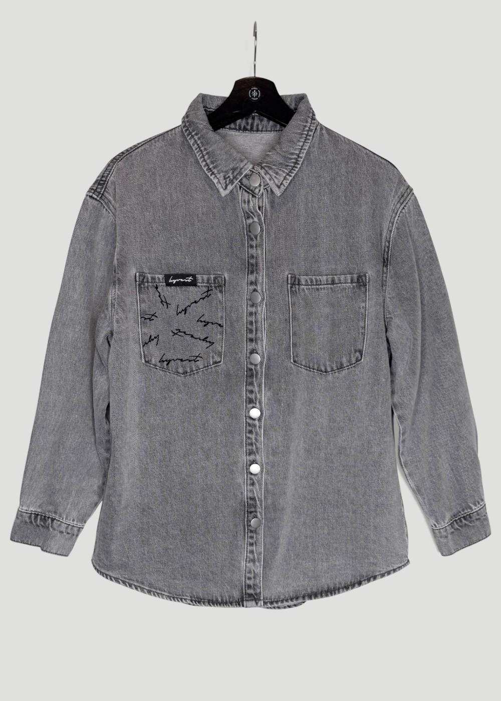 Das Jeanshemd Oversized Print Grey verbindet grey washed Denim mit einem lockeren oversized Cut. Der Signature Logo-Print setzt ein besonderes Detail, ohne den Look zu dominieren. Das feste und angenehme Jeans-Material macht das Hemd ideal zum Layern – offen über Tops, geschlossen getragen oder als leichte Jacke. Ein echtes Allround-Piece für jede Saison.